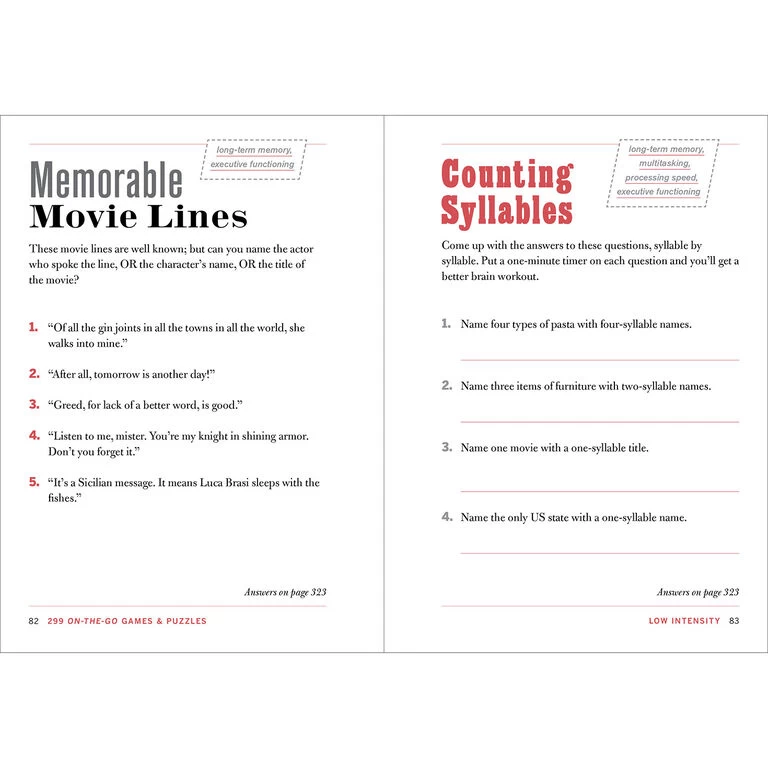 Keep your mental fitness game strong, even on-the-go, with a book of challenging puzzles and games. This portable-sized paperback of 299 puzzles is arranged in difficulty from “Easy Does It” to “Finish Strong,” with puzzles that help you sharpen six key cognitive functions: