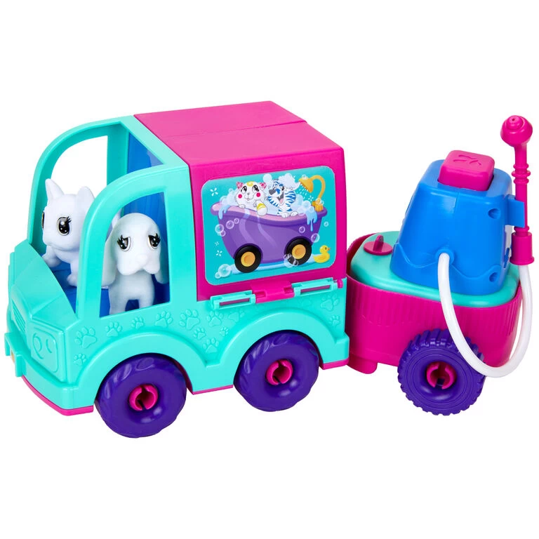 - Includes 1 toy truck with cart and hand-pump hose, 2 animal figurines, 3 washable markers and scrub brush.