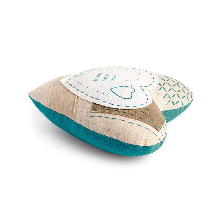 Turn mom’s favorite chair into a sweet oasis with this heart-shaped pillow to remind her of her place in the family. Cotton and linen patchwork pillow features a screen printed message front and center, with teal embroidery and coordinating teal fabric backing adding a touch of charm.