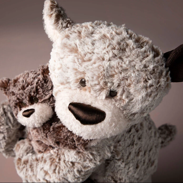 - You and Me Giving Bears from Demdaco includes a big gray bear with 1 corduroy ear hugging a small, dark-gray bear.