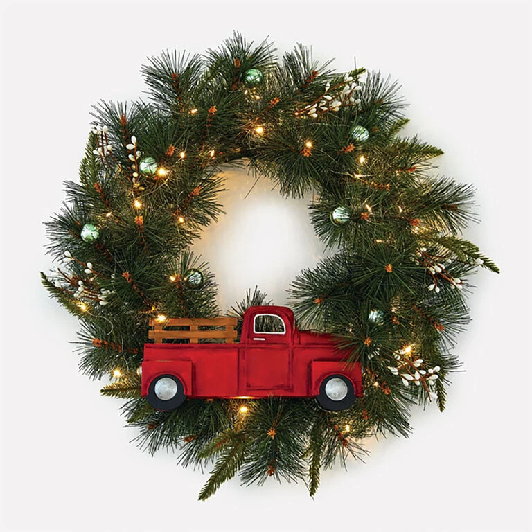 - Hallmark Channel Christmas wreath features faux pine branches with berry picks, fairy lights and a red truck decoration.