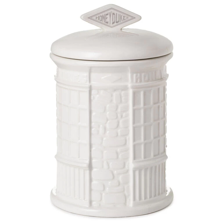 - Harry Potter ceramic treat jar with lid features Honeydukes Sweet Shop design.