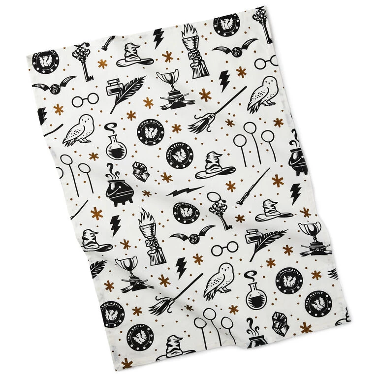 - Harry Potter cotton tea towel features Wizarding World icons.