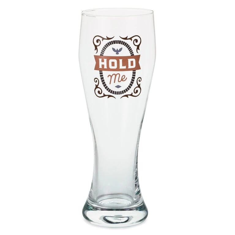 - Pilsner glass features a fun caption.