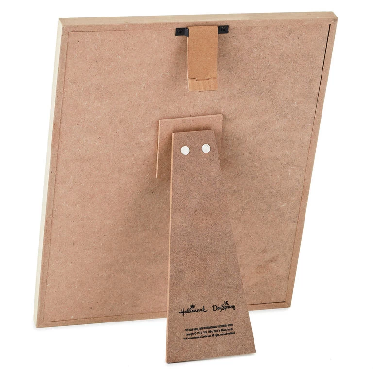 - Quote sign printed with a Scripture verse features a gray background and wooden frame.