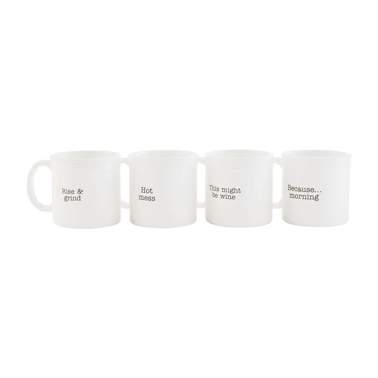 - Set of 4 ceramic mugs feature embossed rims and different funny messages.