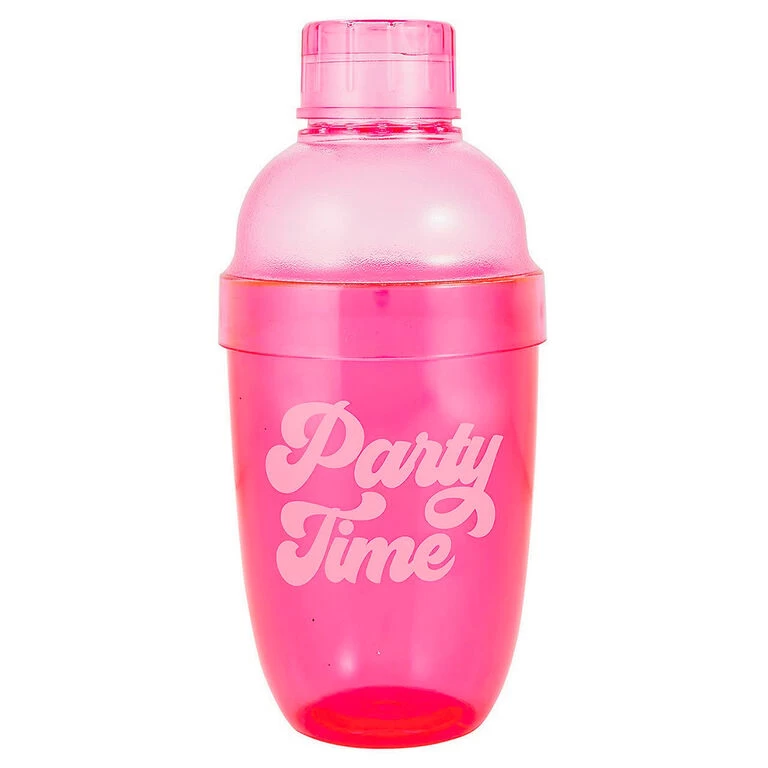 - Cocktail shaker set includes pink acrylic shaker and accessories for two drinks.
